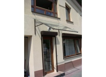 Входные козырьки могут быть различной формы: арочными, куполообразными, или иметь одно или многоскатную, прямую или наклонную крышу. По способу крепления козырьки бывают опорными, когда опора производится на колонны или навесными, когда в качестве крепления используются тросы.